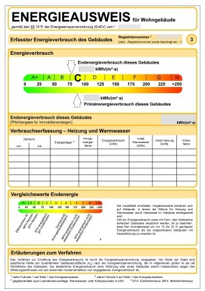 Wenn mindestens für drei Jahre alle Verbrauchsdaten vorliegen und keine großen Veränderungen geplant sind, kann ein Verbrauchsausweis erstellt werden. Die ausgewiesene Primärenergie stellt einen Vergleichswert zu dem Referenzhaus dar und gibt Auskunft über den Rang des Energieverbrauch eines Gebäudes.